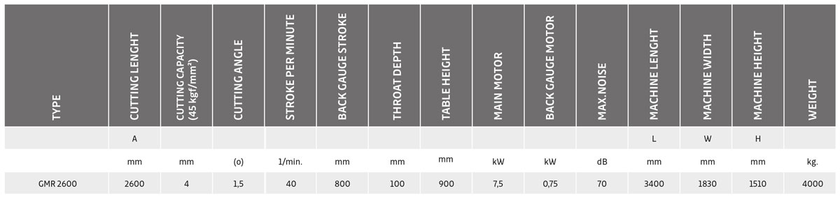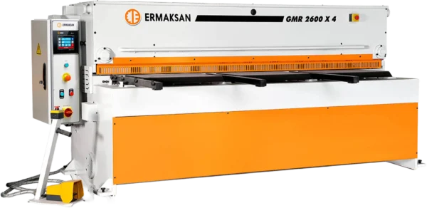 ERMAKSAN GMR mechanical guillotine shears are specially designed for thin sheet metal materials, working very efficiently at high speeds and offering the best shearing performance in their class. ADVANTAGES – Low investment cost. – High efficiency. – Ergonomic design. – Energy saving. – Quiet operation. – Does not require large floor space. – Different color options. – Durable choice for your precise cutting jobs. – Easy installation and training. GENERAL FEATURES – High cutting quality can be achieved at high speeds, with a space-saving body. – Suitable throat depth of 4mm GMR for continuous strip cutting (standard throat depth 100mm). – GMR 4mm; bearing between graphite bushings, – GMR 3mm; upper jaw moves on rails between – High power transmission and torsional resistance, balanced shaft assembly. – GMR 4mm has a gap that is easy to adjust manually with one hand – Mechanically. Clamping system that prevents the sheet from slipping during cutting – GMR 3mm, 600mm, GMR 4mm 800mm stroke machines and 0.1 mm precision stop system – Quiet operation, easy maintenance, fast and motor unit + gearbox as standard. Front safety plate for CE standard. – Wide arms and side miter for cutting wider sheet metal – Electrical system tested by SIEMENS – ERCUT-5 multifunction, parametric adjustable, and programmable controller. – Sheet metal sliding unit for removing cut material